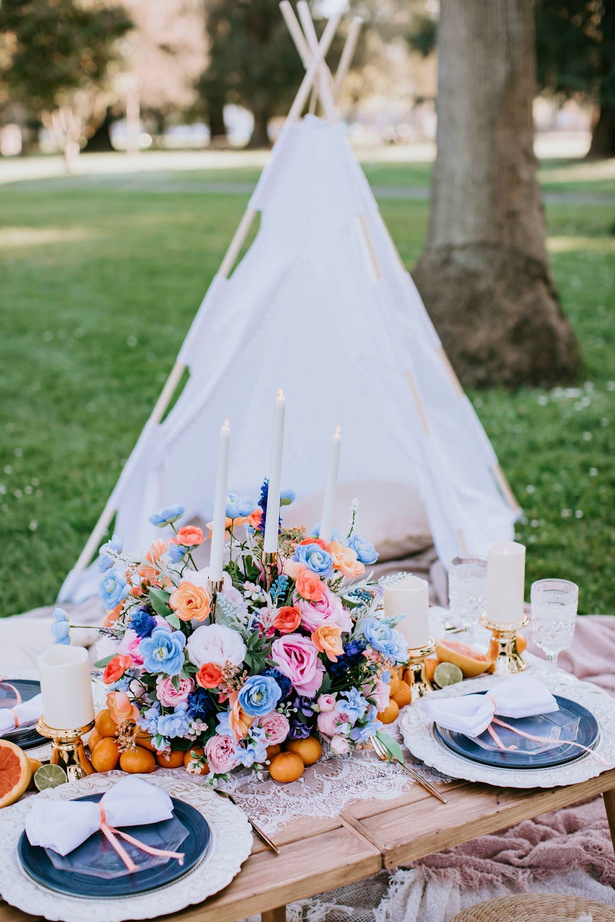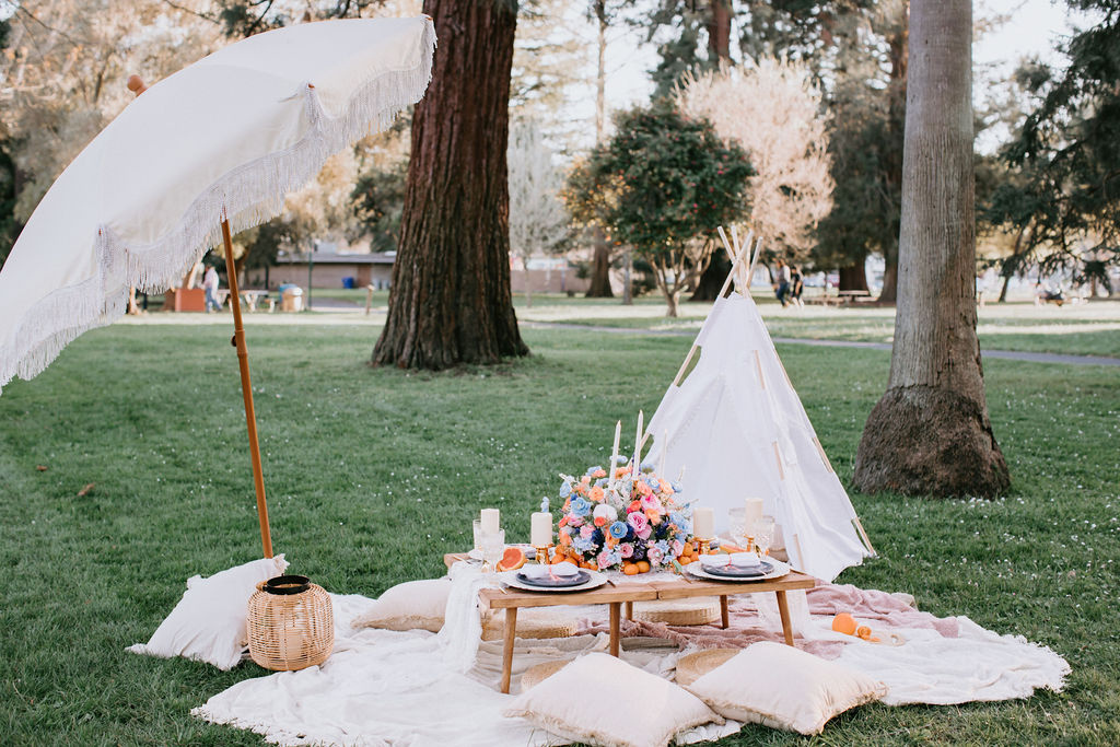Includes: Picnic setup with low top tables, table runner, napkins, blankets, pillows/cushions, plates, silverware, glasses, artificial flower arrangements, decorative arch, chalkboard sign, teepee, other decor.