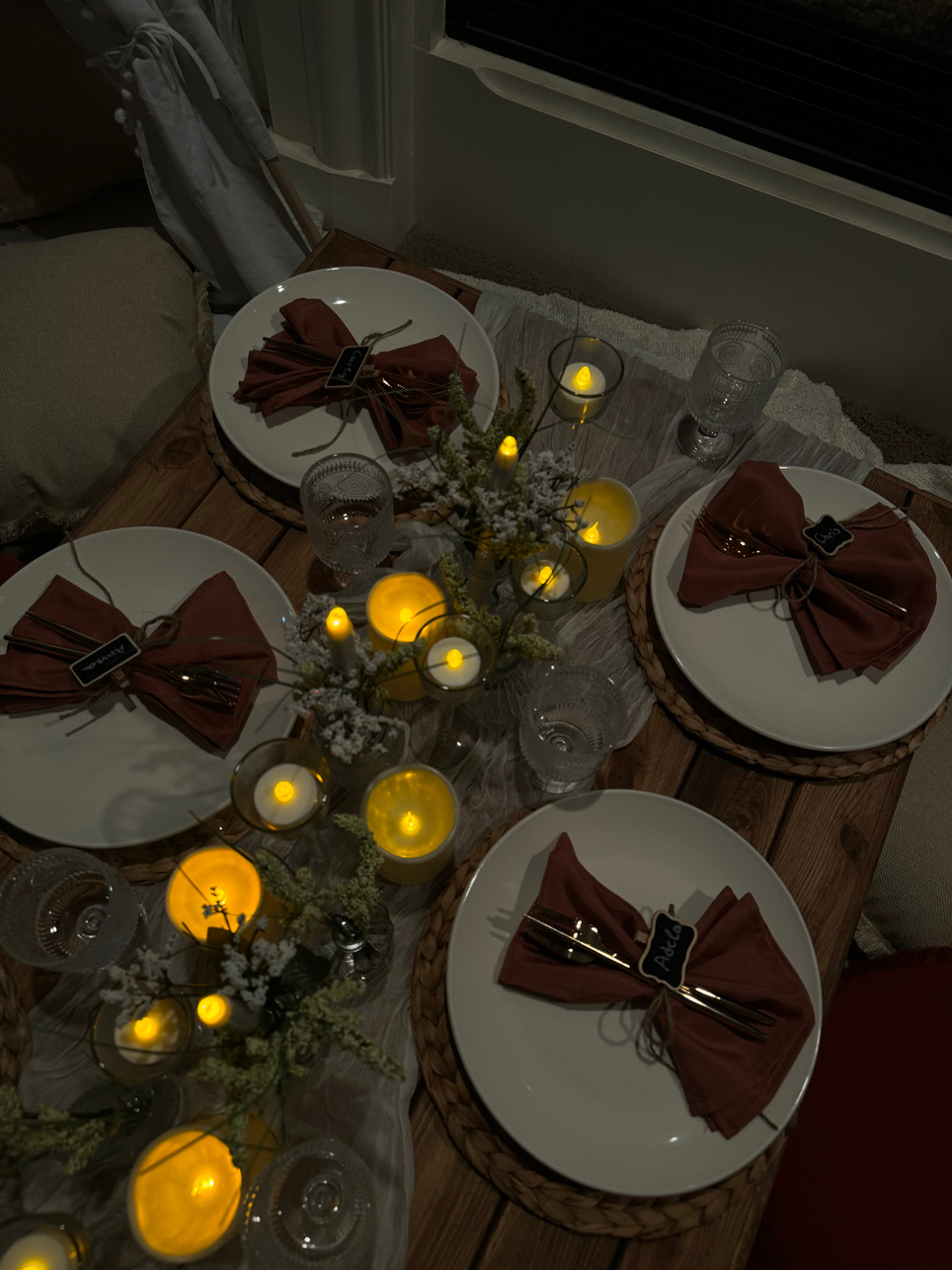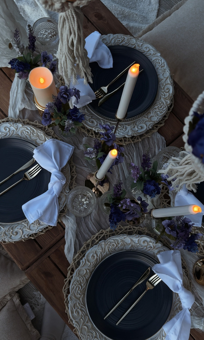 Looking for an elegant or fun way to set up your table for your next event? We got you! This service includes: charger plates/placemates, plates, silverware, table runner, napkins, flower arrangements, other decor.